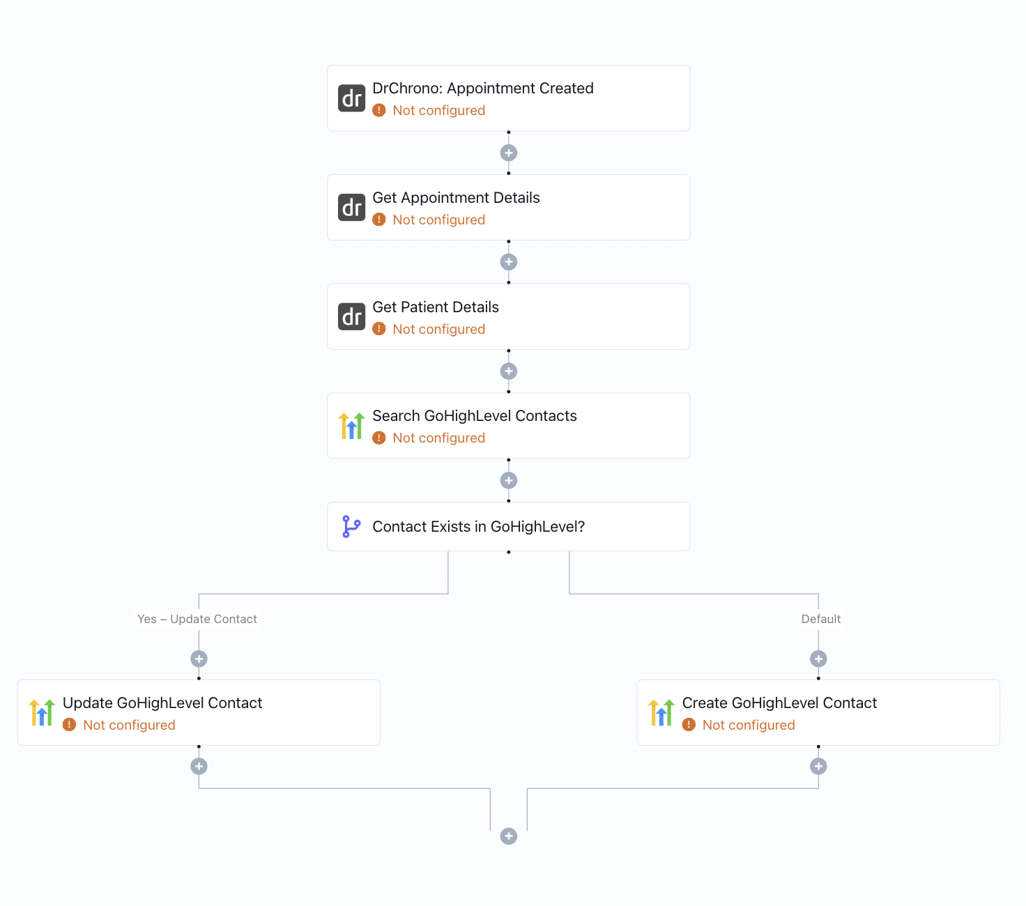 When a DrChrono appointment is updated, this workflow checks GoHighLevel for the matching patient and either tags the existing contact or creates a new one - keeping your CRM perfectly in sync.