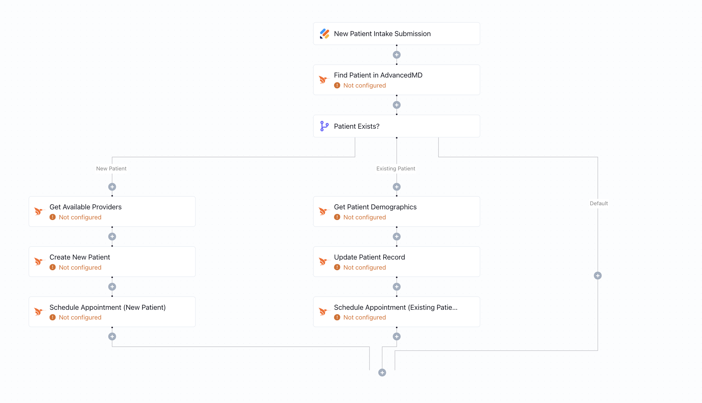 Your intake-to-scheduling flow involves too many manual steps: check if the patient exists, create or update their record, then book the appointment. This should all happen automatically.