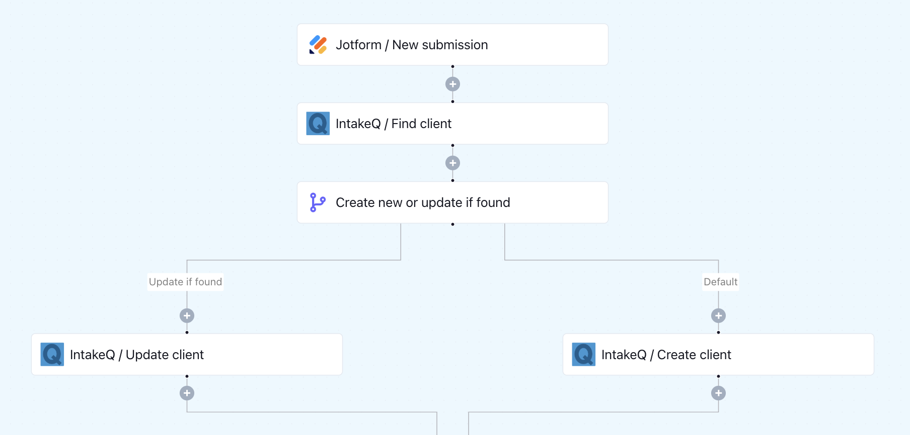 This workflow captures patient intake data submitted through a Jotform and syncs it with your IntakeQ client database. It starts by checking if a client with matching details already exists in IntakeQ. If a match is found, their profile is automatically updated with the latest submission data. If no match is found, a new client record is created in IntakeQ. This ensures every patient form submission is properly captured, whether it’s a returning patient or someone new to your practice.